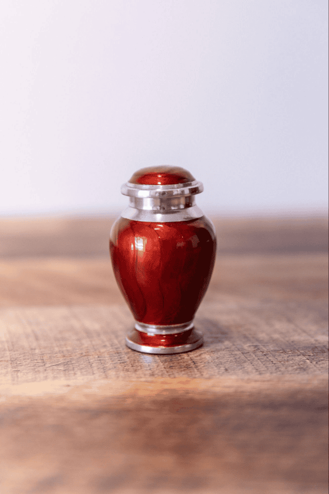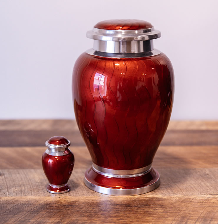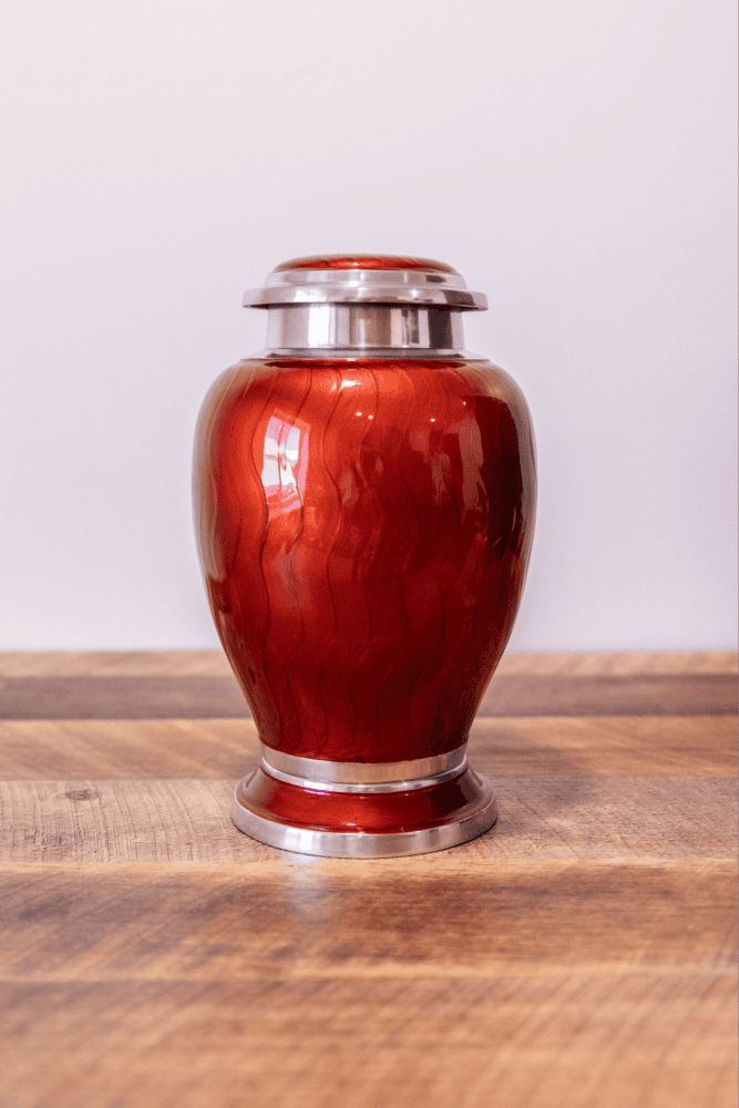 This aluminum cremation urn showcases a stunning high-gloss, hand-applied patterned, enamel finish. Its elegant, rounded shape is enhanced by nickel silver bands that adorn the top, bottom, and lid. The urn features an airtight threaded lid for secure closure and a felt-lined base to protect surfaces, making it both beautiful and functional.