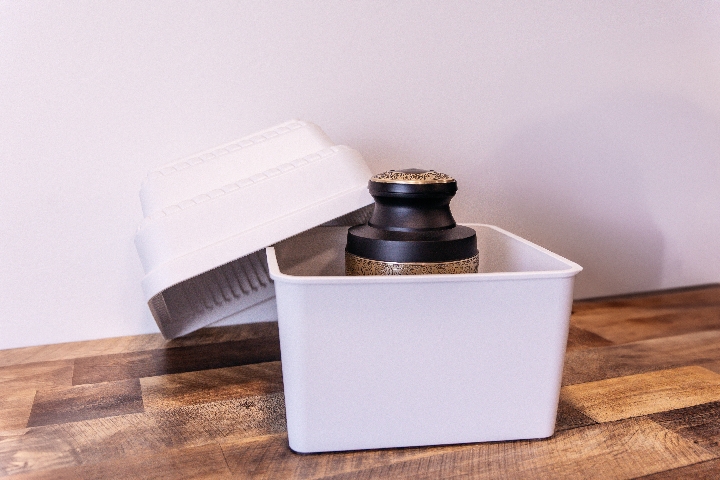 The Luxor urn vault, crafted from industrial-strength polymer, is made using an injection molding process that ensures precision and smooth satin finishes. It features a decorative double rope motif along the outer edge and includes two tiers for accommodating different urn sizes. Additionally, a silicone rubber sealant provides durability and peace of mind.
